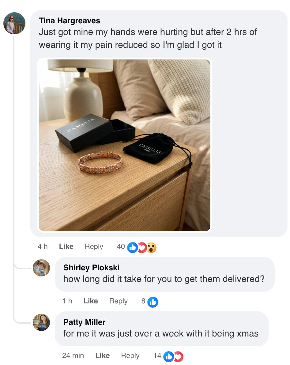 The Camelia Copper Bracelet combines pure copper with therapeutic magnets to naturally ease joint pain and tension throughout your day.
